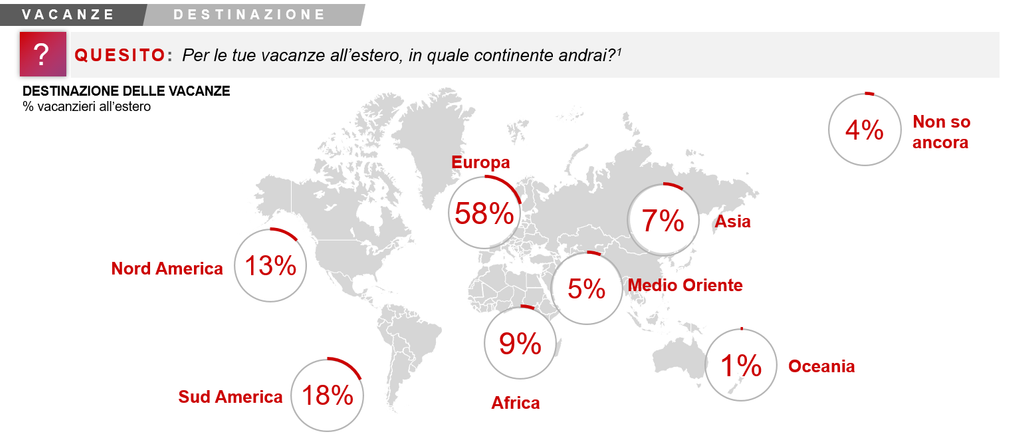 “Gli italiani dimostrano di apprezzare particolarmente il turismo locale: l’Italia rimane infatti la meta preferita per il 77% degli italiani, in aumento rispetto allo scorso anno. Per chi andrà all’estero, l’Europa e il Sud America sono sul podio”