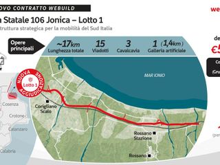 MILANO (ITALPRESS) - Webuild si è aggiudicata il contratto da 531 milioni di euro per la realizzazione del Lotto 1 della Strada Statale 106 Jonica, una delle arterie stradali più strategiche della Calabria, nel tratto compreso tra il viadotto Coserie e lo svincolo di Corigliano Ovest. "Il progetto - si legge in una nota - rafforza il ruolo di Webuild nello sviluppo delle infrastrutture strategiche del Sud Italia: con la sua aggiudicazione diventano 20 i progetti che Webuild sta realizzando nel Sud Italia, isole comprese, per un valore complessivo aggiudicato che sale a circa 16 miliardi, dando occupazione a 9.500 persone, tra diretti e di terzi (al 30 settembre 2025), e con 7.500 fornitori diretti coinvolti da inizio lavori".Il nuovo lotto della SS106 Jonica, commissionato da ANAS (Gruppo FS Italiane), prevede circa 17 km di nuova strada statale, con opere di elevata complessità ingegneristica tra cui 15 viadotti e 3 cavalcavia, per un totale di 3 km, e una galleria artificiale a doppia canna di 1,4 km. Per l'esecuzione dei lavori, si prevede saranno occupate fino a circa 500 persone, tra personale diretto e di terzi, puntando anche alla valorizzazione del patrimonio di competenze ed esperienze maturate nell'ambito della realizzazione Terzo Megalotto della SS106 Jonica, dove Webuild è già operativa.Durante la costruzione, è prevista l'adozione di tecnologie per potenziare la sicurezza sul lavoro, ridurre l'impatto ambientale delle attività, garantire il risparmio idrico ed energetico, e favorire la gestione digitale del cantiere. E' prevista inoltre la messa in opera di un sistema di monitoraggio strutturale dell'infrastruttura una volta entrata in esercizio.Sulla SS106 Jonica Webuild realizzerà complessivamente circa 55 km della nuova arteria stradale. I lavori del Terzo Megalotto, che rappresenta il principale intervento previsto lungo la tratta calabrese della SS106 e contribuirà a collegare i litorali jonici di Calabria, Basilicata e Puglia, hanno raggiunto circa l'80% di avanzamento complessivo. Per la realizzazione del progetto ad oggi sono impiegate circa 1.200 persone, tra personale diretto e di terzi, con il coinvolgimento da inizio lavori di una filiera produttiva di oltre 880 imprese, di cui il 45% calabresi. In Calabria, Webuild si è recentemente aggiudicata anche il Raddoppio Paola-Cosenza sulla linea ferroviaria ad alta velocità Salerno-Reggio Calabria, commissionato da RFI (Gruppo FS Italiane), per cui si prevede la realizzazione di oltre 22 km di nuova linea, inclusa la Galleria Santomarco, opera principale, che si estenderà per 15 km.- Foto ufficio stampa Webuild -(ITALPRESS).
